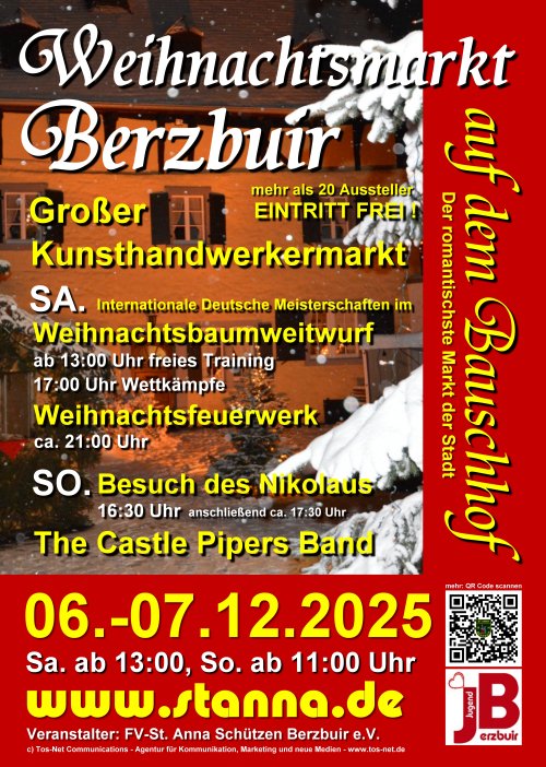 Ein Weihnachtsmarkt mit verschiedensten Angeboten vom leckeren Glühwein, über weihnachtliche Spezialitäten bis zu handgefertigten Dekoartikeln. Auch in diesem Jahr sorgen wir wieder, passend zur weihnachtlichen Stimmung, für eine tolle Lichtgestaltung des alten Gemäuers. Und noch etwas besonderes gibt es in Berzbuir. Wir lassen den Weihnachtsmarkt auf dem Bauschhof zu Berzbuir Samstag (06.12.2025) wieder im bunten Zauber eines Feuerwerks erstrahlen und am Samstag richten wir hier die Internationale Deutsche Meisterschaft im Weihnachtsbaumweitwurf aus.