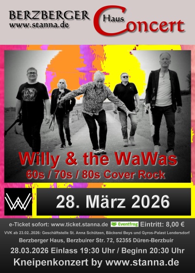 Handmade Rock vom Feinsten. Willy & the WaWas lassen den Sound der 60s /70s und 80s Jahre wieder auferstehen. Die Zeit der Rebellion, des Aufbruchs und die Zeit der Befreiung von verknöcherten Normen und Konventionen. Die Musik des Aufbruchs und der wilden Jahre von Generationen. Musik live gespielt von Rockern der alten Schule auf der Hautnah-Bühne des Berzberger Hauses. Ein Kneipenkonzert mit Bewirtung das einmal mehr verspricht zu einem Higlight des Rocks zu werden. Rock me, rock us, Rock all over the world. Eintritt 8,00 €