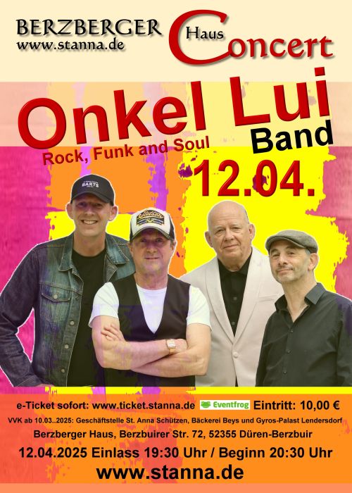 10 Jahre Hauskonzert im Berzberger Haus. und in diesem Jahr stellen wir Euch die famose Onkel Lui Band vor. Das Konzert findet am 12.04 2025 statt.